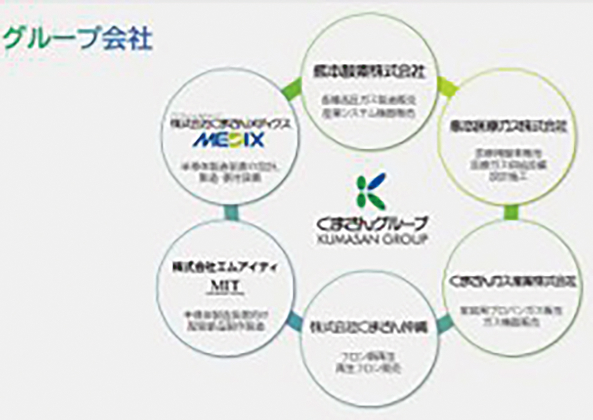 医療・産業用酸素・瓦斯・溶剤関連、半導体製造装置設計・組立、品質管理・メンテナンス企業として確固たる事業基盤を築いている。地域社会への幅広い貢献を実現するために分社化を進め、分離化された組織体制のもとで「くまさんグループ」を形成。各社が独自性を発揮できる環境を整えながら、人材育成にも積極的に取り組んでいる。