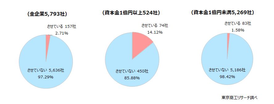 規模別では、「させている」は大企業が14.1%(524社中、74社)、中小企業は1.5%(5,269社中、83社)で、大企業では多くの日本人が駐在しており、対応を迫られている。