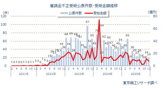 コロナ禍に雇用を支えた「雇用調整助成金」(以下、雇調金)等の不正受給公表は、2025年12月は 全国で19件だった。2025年の合計は344件で、ピークの2023年の692件から半減した。