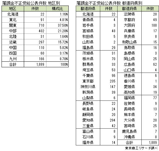 地区別の公表件数は、最多が関東の710件(構成比37.5%)。次いで、中部402件、近畿297件、九州166件、中国110件、東北91件、四国60件、北陸31件、北海道22件の順。