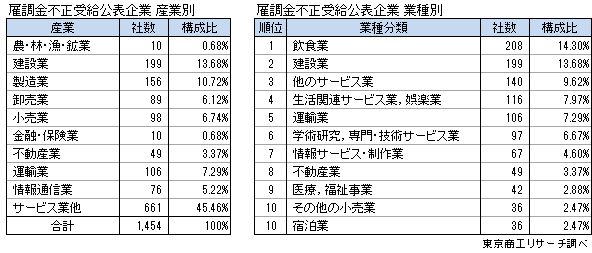 雇調金等の不正受給が公表された1,889件のうち、TSRの企業情報データベースで分析可能な1,454社(個人企業を含む)を対象に、産業別と業種別に集計した。