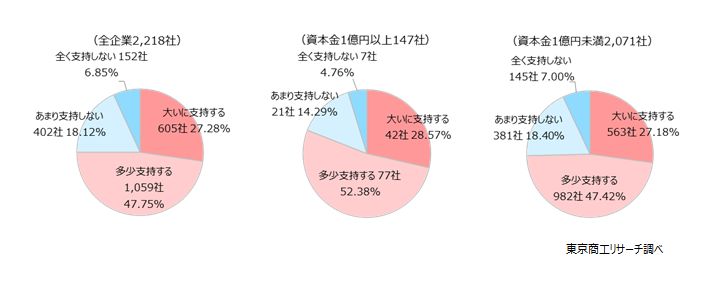 規模別では、「支持する」が大企業80.9%(147社中、119社)、中小企業74.6%(2,071社中、1,545社)で、大企業が中小企業を6.4ポイント上回った。