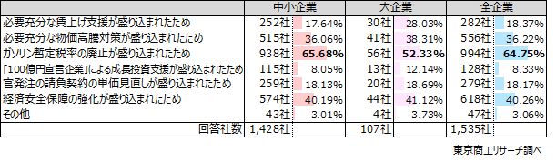 次いで、「経済安全保障の強化が盛り込まれたため」の40.2%(618社)、「必要充分な物価高騰対策が盛り込まれたため」の36.2%(556社)と続いた。