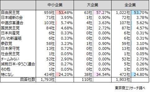 企業がどの政党を支持しているか聞いたところ、1,903社から回答を得た。