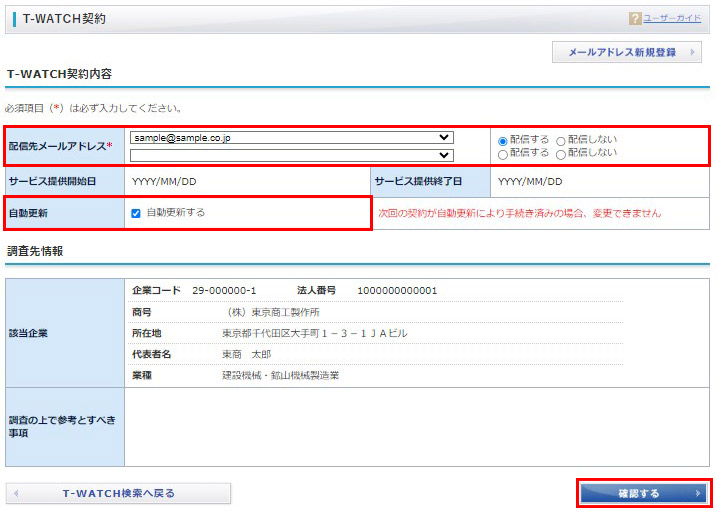 配信先メールアドレス、サービス提供開始日、その他の情報を入力し、「確認する」をクリックします。